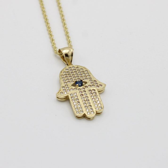 14K Hamsa Pendant Cz Stones With Rope Chain Yellow Gold