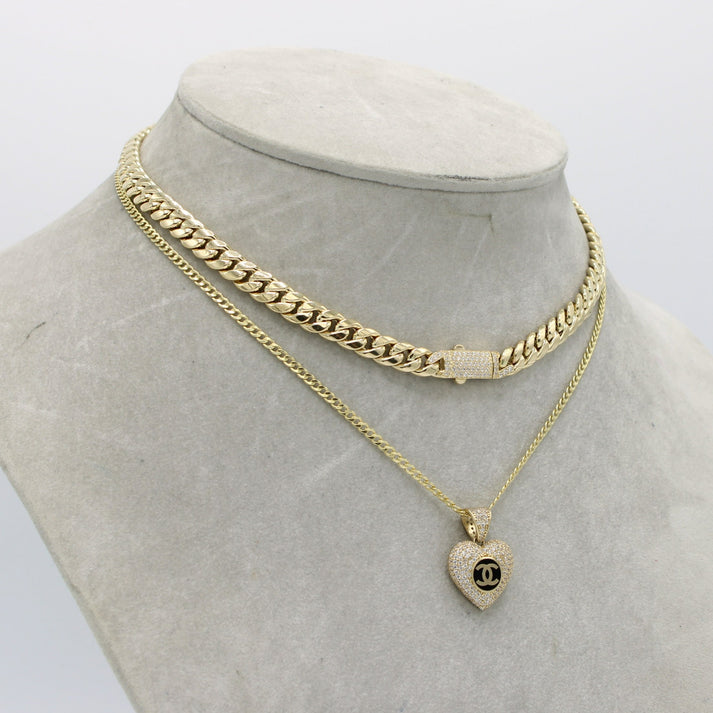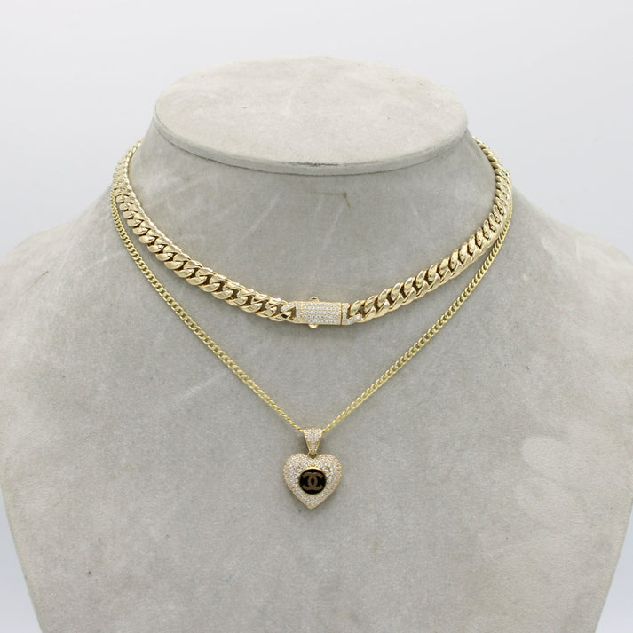 14K Set ITTALLO Choker and Heart Pendant Cz Stones With Cuban Chain Yellow Gold